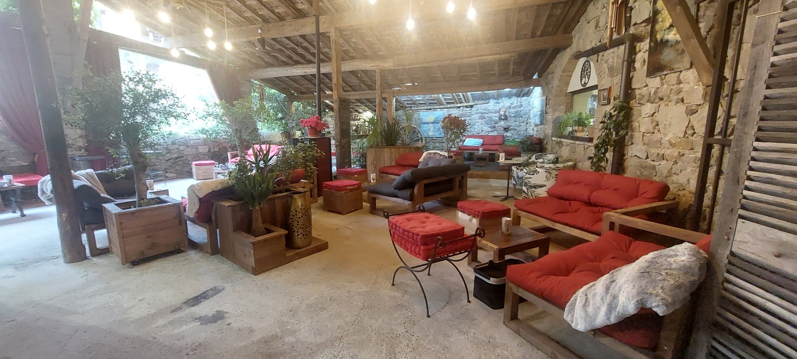 Un vaste lounge en pierres apparentes, lourdes tentures et sofas XXL a été privatisé exceptionnellement pour nous.
