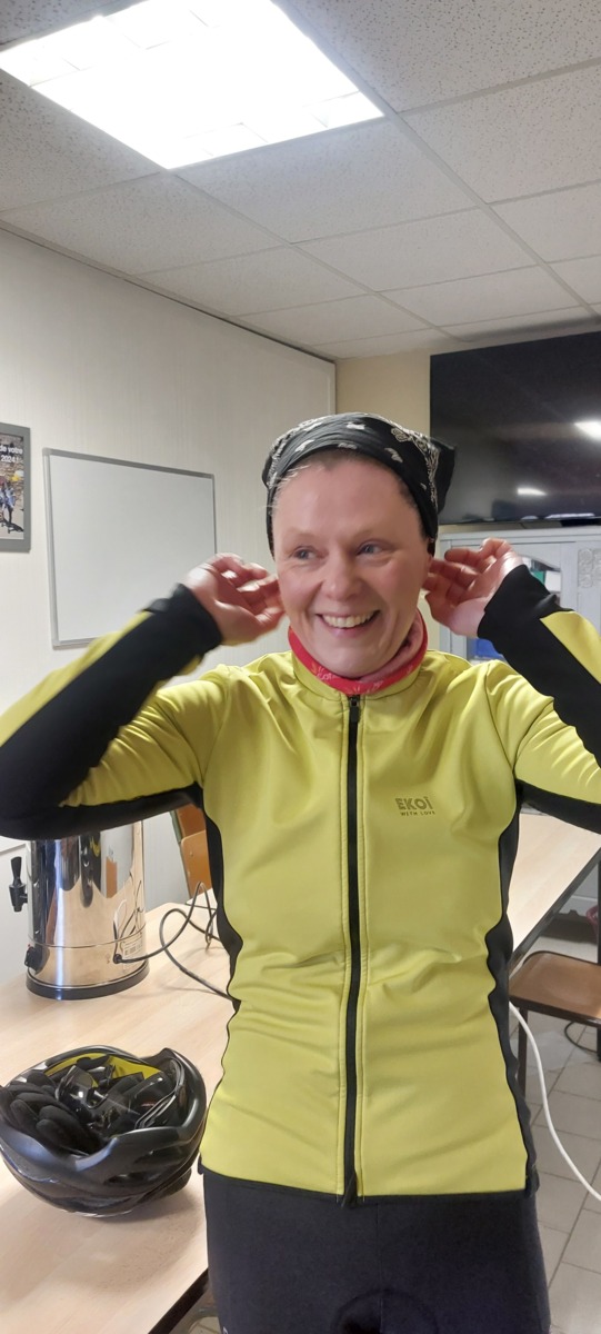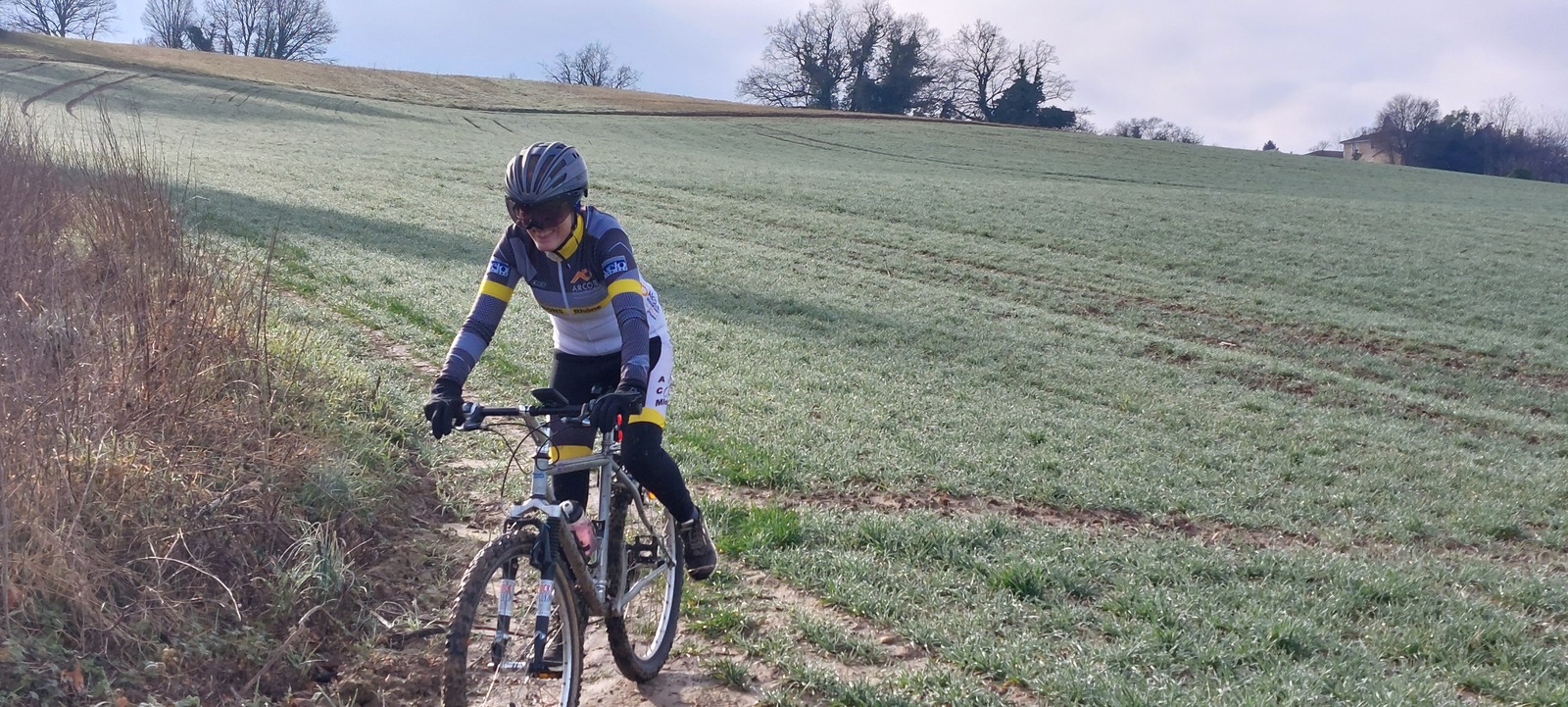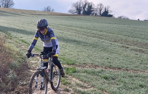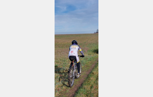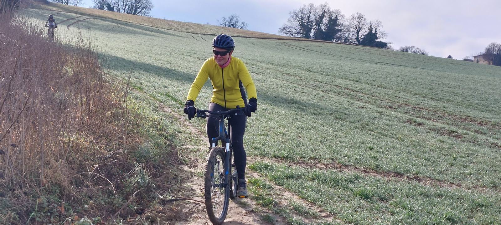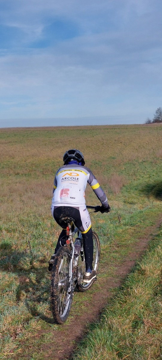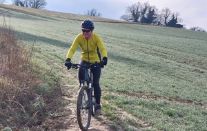 Côté vttistes Pierrette étrennait son nouveau bolide ! Après avoir tenté de moissonner un champ de jeunes pousses de blé avec son engin, elle a regagné la piste tracée beaucoup plus confortable.